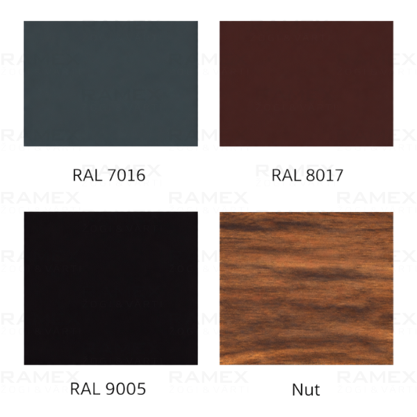 - Apdare: pulverkrāsa (RAL7016, RAL8017, RAL9005, Nut, Golden Oak)